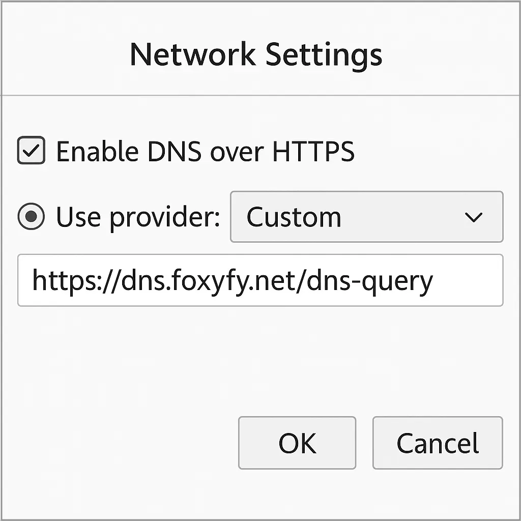 - Firefox: Settings → Network → Enable DoH → Custom → https://dns.foxyfy.net/dns-query