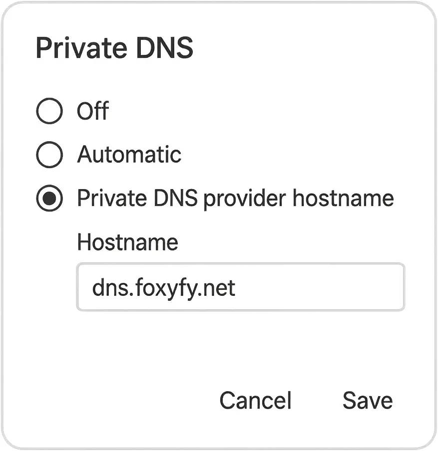 - Android 9+: Settings → Network & Internet → Private DNS → Private DNS provider hostname → dns.foxyfy.net → Save