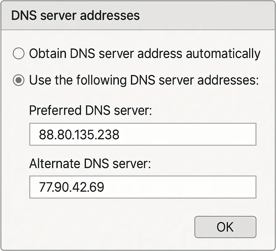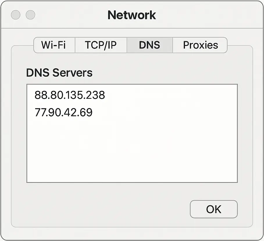 - Windows/macOS/iOS (Wi-Fi): Set custom DNS on the network and add our IPs.