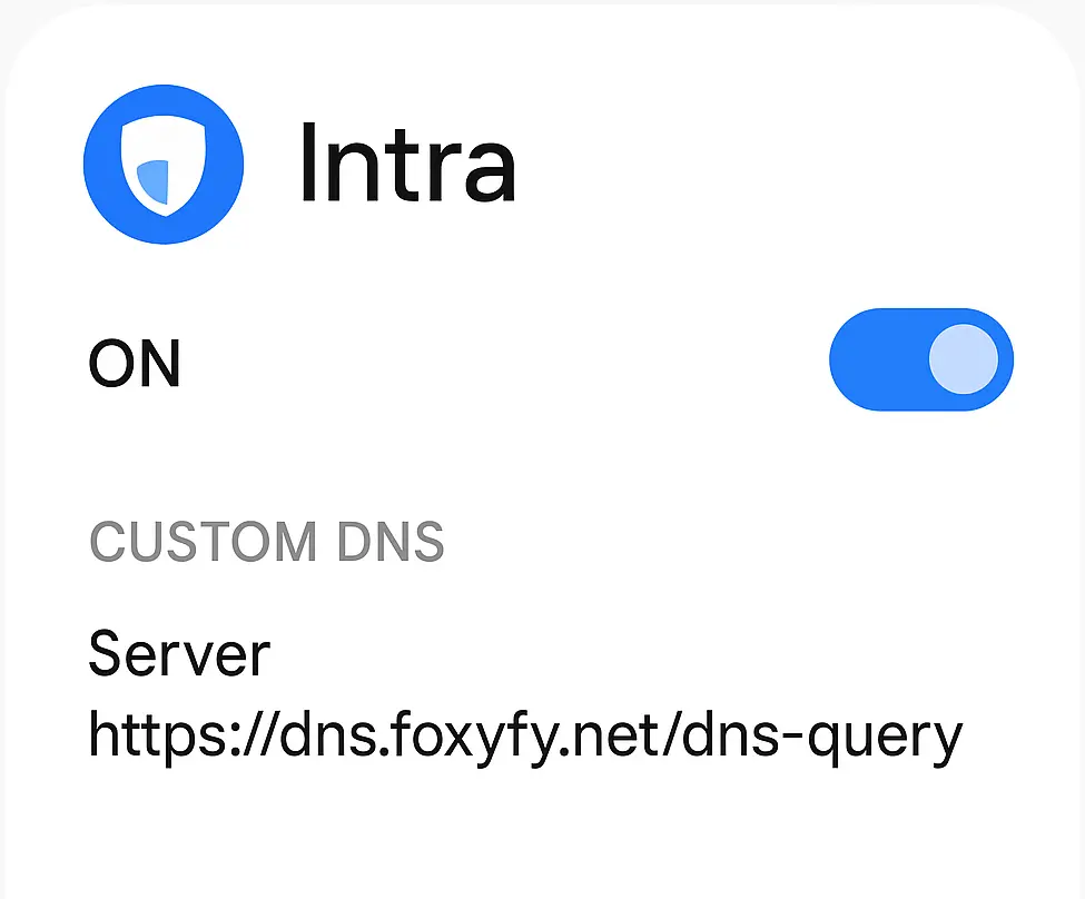 - Android (app): Install Intra → Custom server → https://dns.foxyfy.net/dns-query → Enable.
