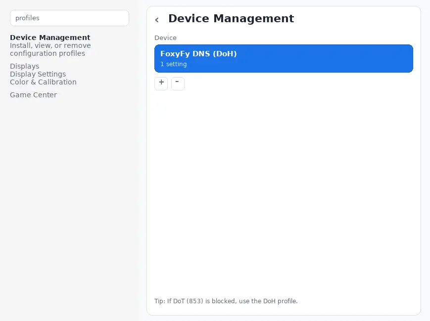 - MacOS: Download "DoT.mobileconfig" (below) → Double click to install → Settings → Profiles → Install → Password